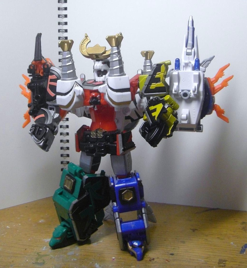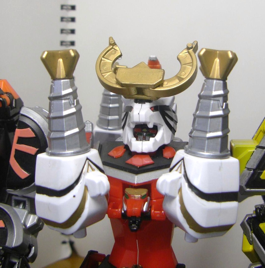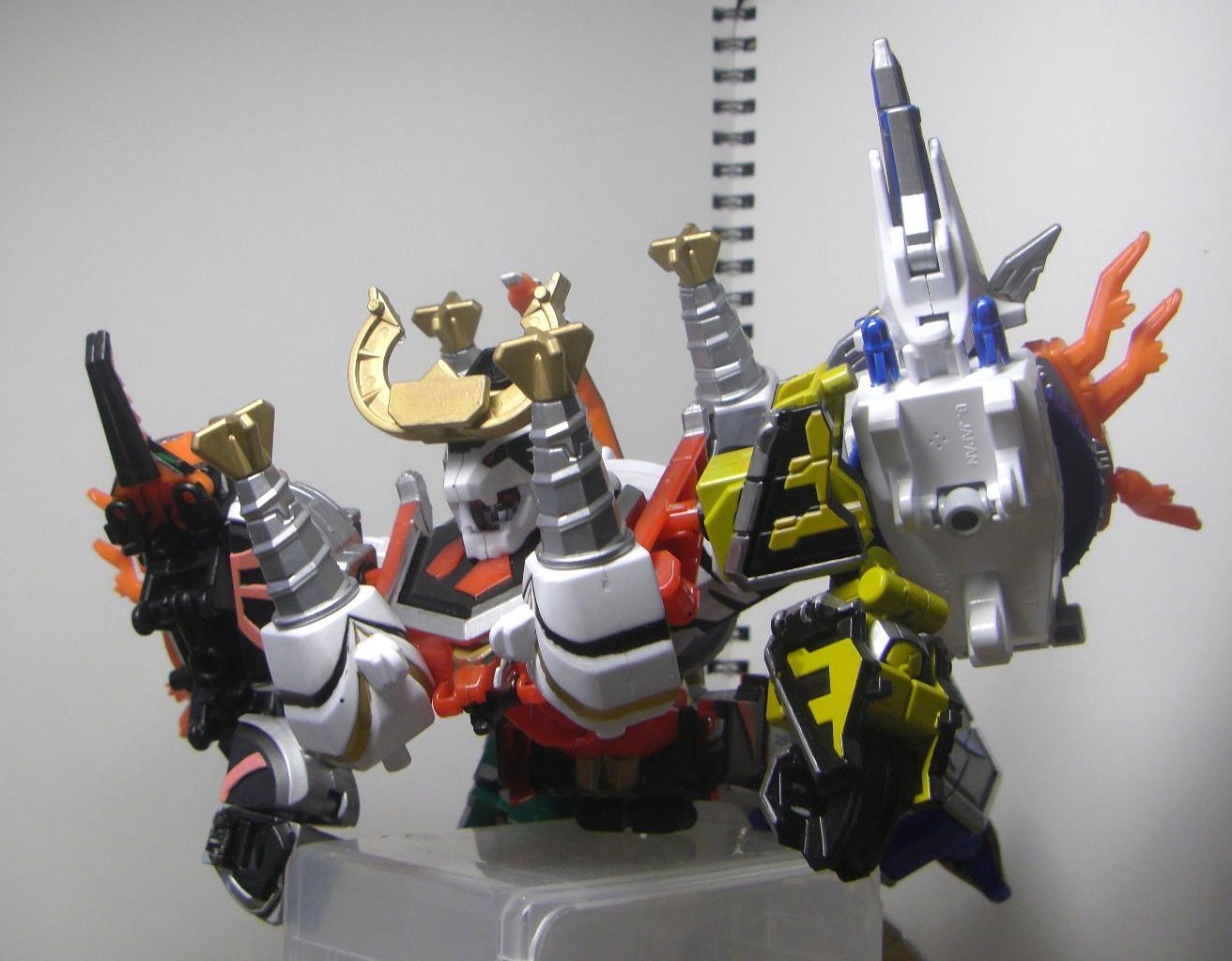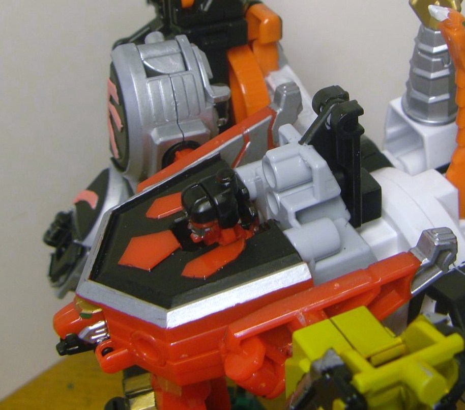 ダイテンクウ合体形態へ。虎は頭と尻尾を外し胴体は横倒しに、兜は脚を差し替えて角を外し、舵木は尻尾を外し、兜の脚を取りつけます。