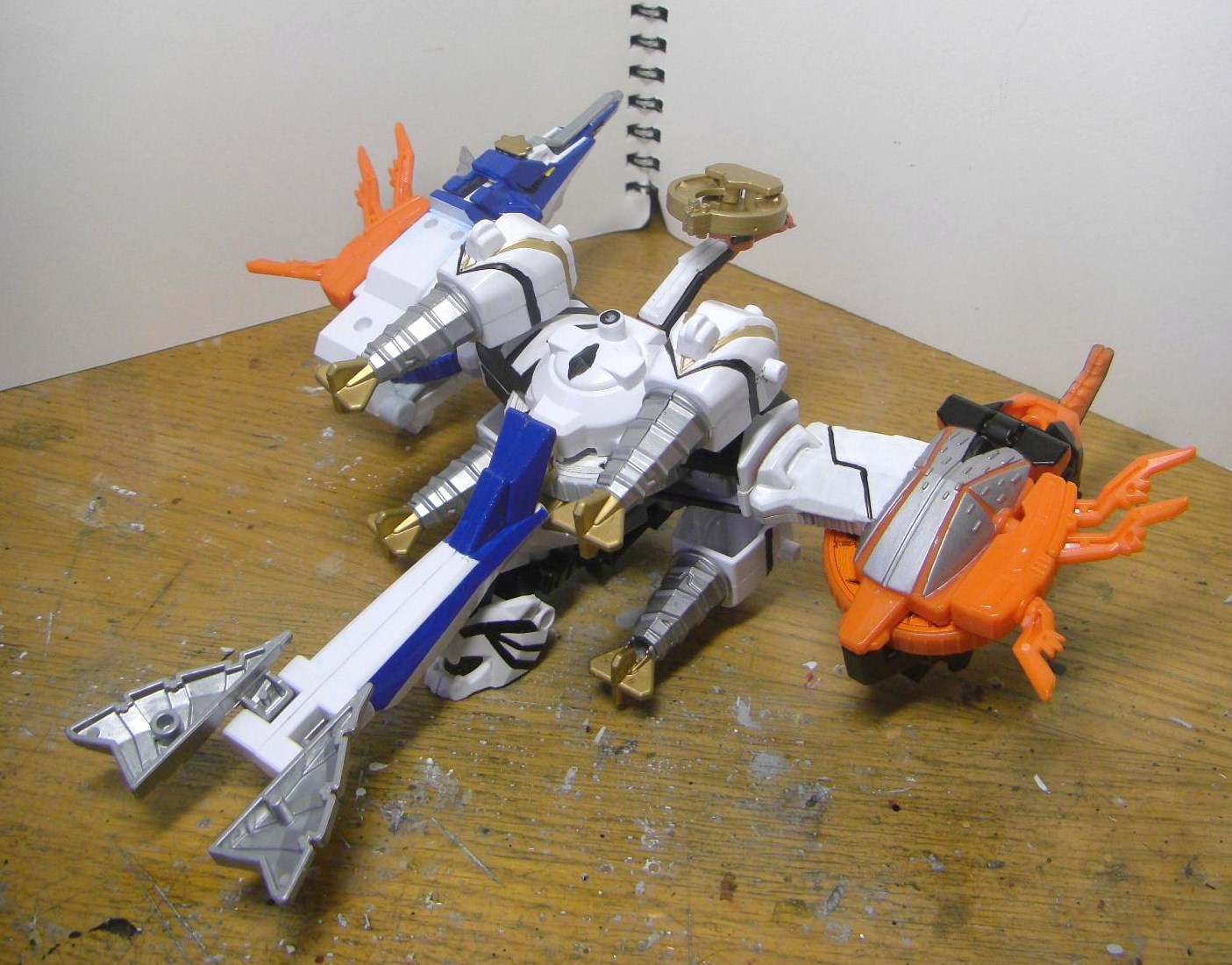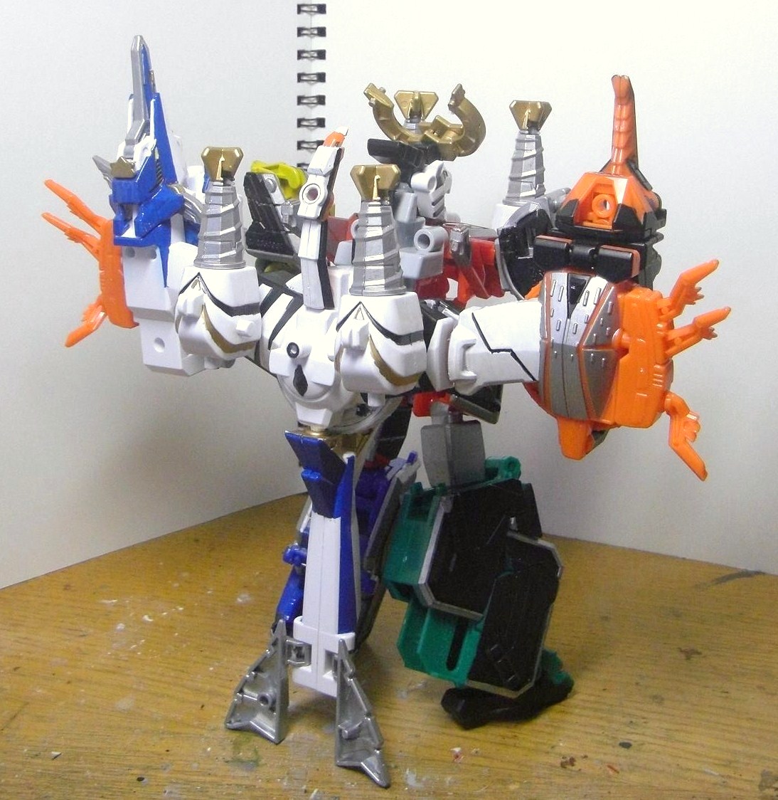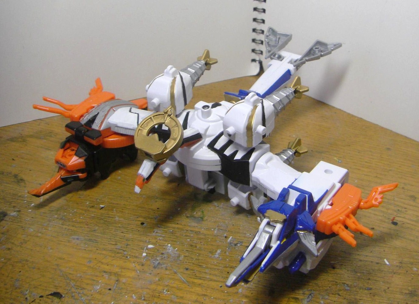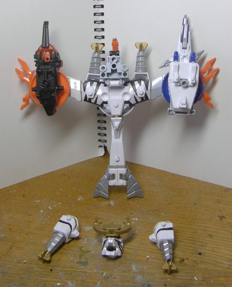 ダイテンクウ合体形態へ。虎は頭と尻尾を外し胴体は横倒しに、兜は脚を差し替えて角を外し、舵木は尻尾を外し、兜の脚を取りつけます。