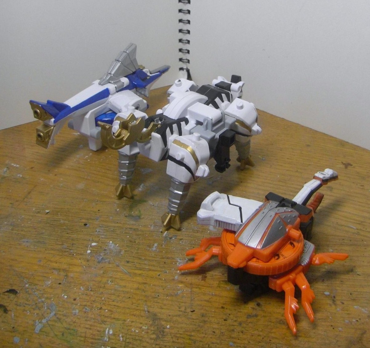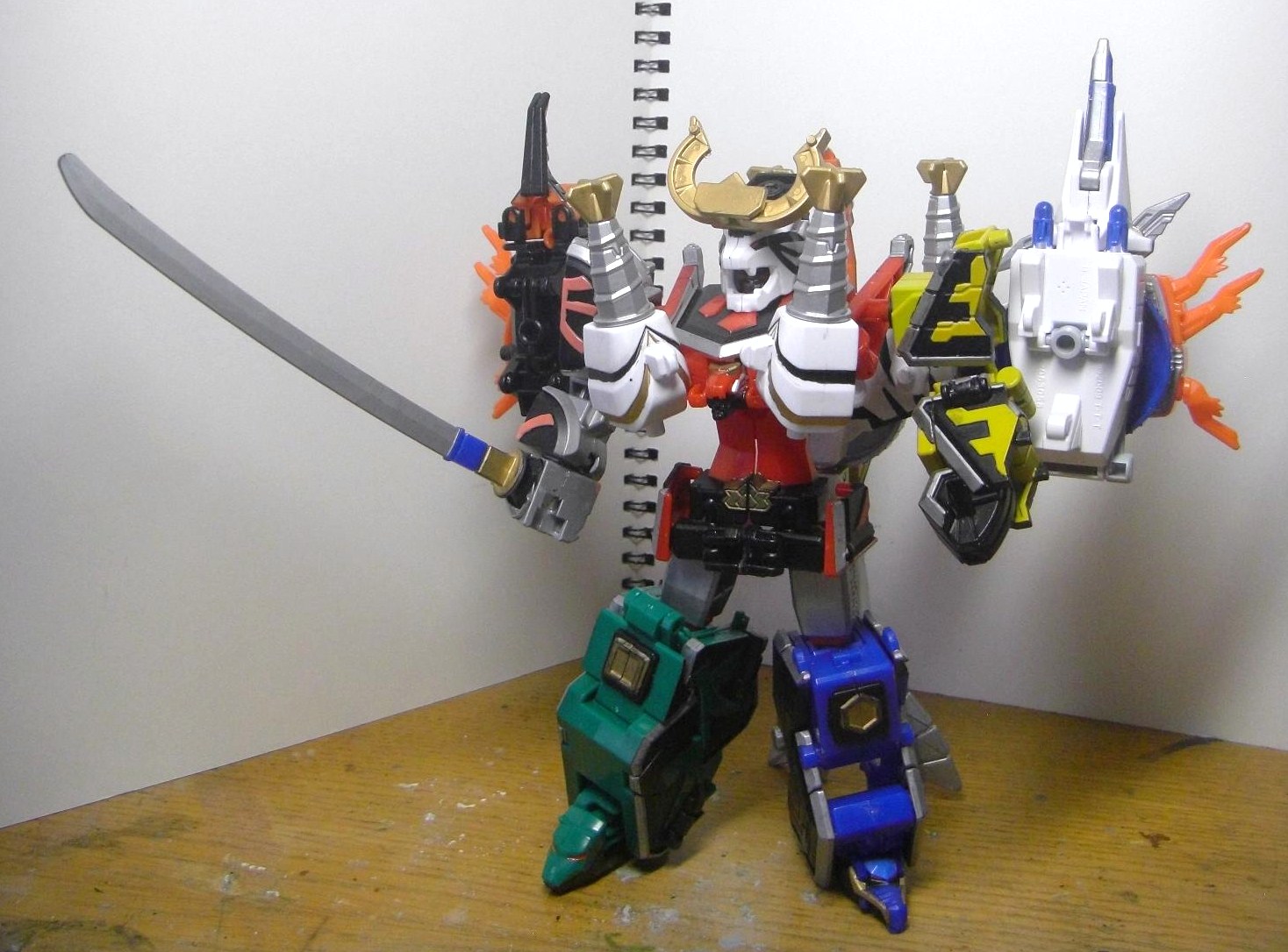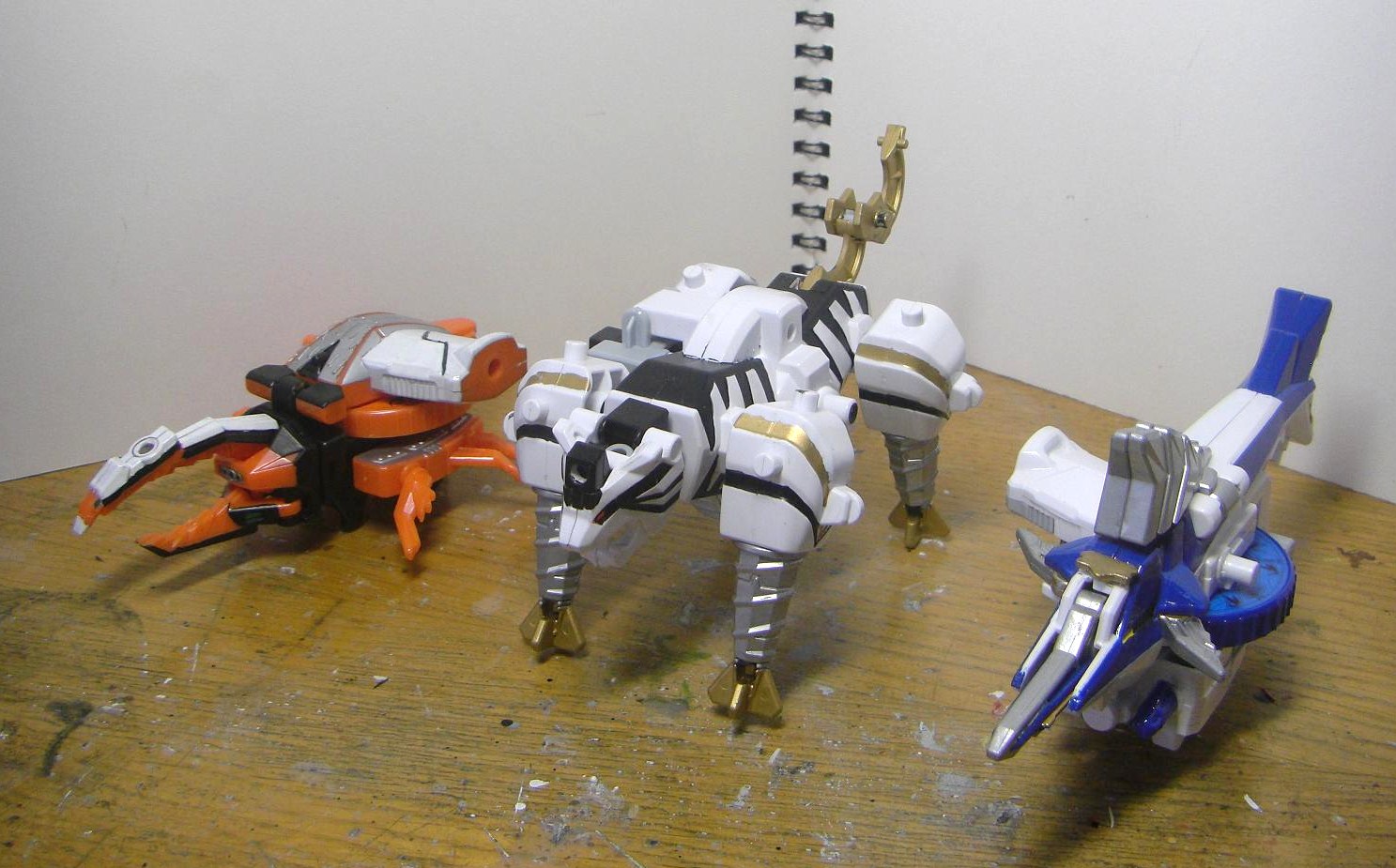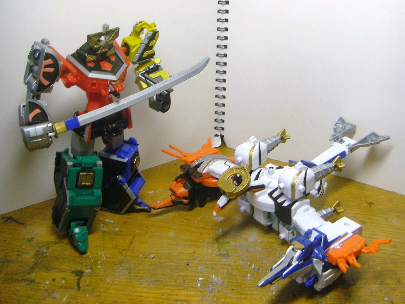 ダイテンクウ合体形態へ。虎は頭と尻尾を外し胴体は横倒しに、兜は脚を差し替えて角を外し、舵木は尻尾を外し、兜の脚を取りつけます。