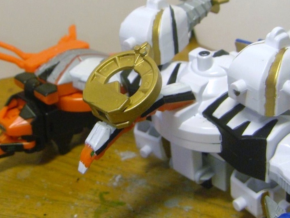 1.まずは尻尾の付け根にある虎折神の頭、ダイテンクウ頭部の角飾り、胴体下部の虎折神の脚を外し、接続用ジョイントを起こします。