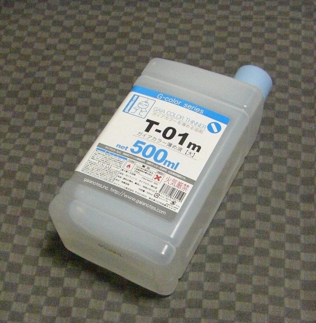 最後に、ガイアノーツのラッカー溶剤。500ml入りでクレオスのより安いので、こっちを好んで使っています。