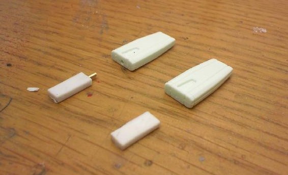 ナイフの柄。元の柄は粉々になったし、そもそも元の柄があまりいい感じではなかったので、1.5㎜のプラ板(1㎜と0.5㎜の積層)に1㎜真鍮線を入れて脱着式にする。裏面は肉抜き穴があるので、これもパテで埋めてしまいましょう。
