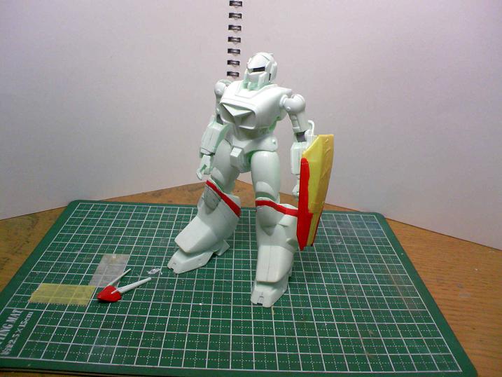 後ろから。気づかないくらい薄めですが、装甲の白い部分も若干ながら塗ってあったりします。まだ何層か塗る積もりなので、その頃にはあらかた継ぎ目も消えてしまうでしょう。