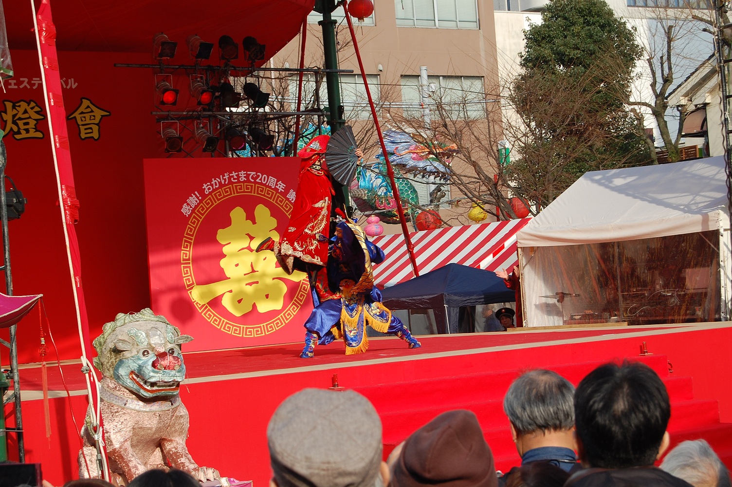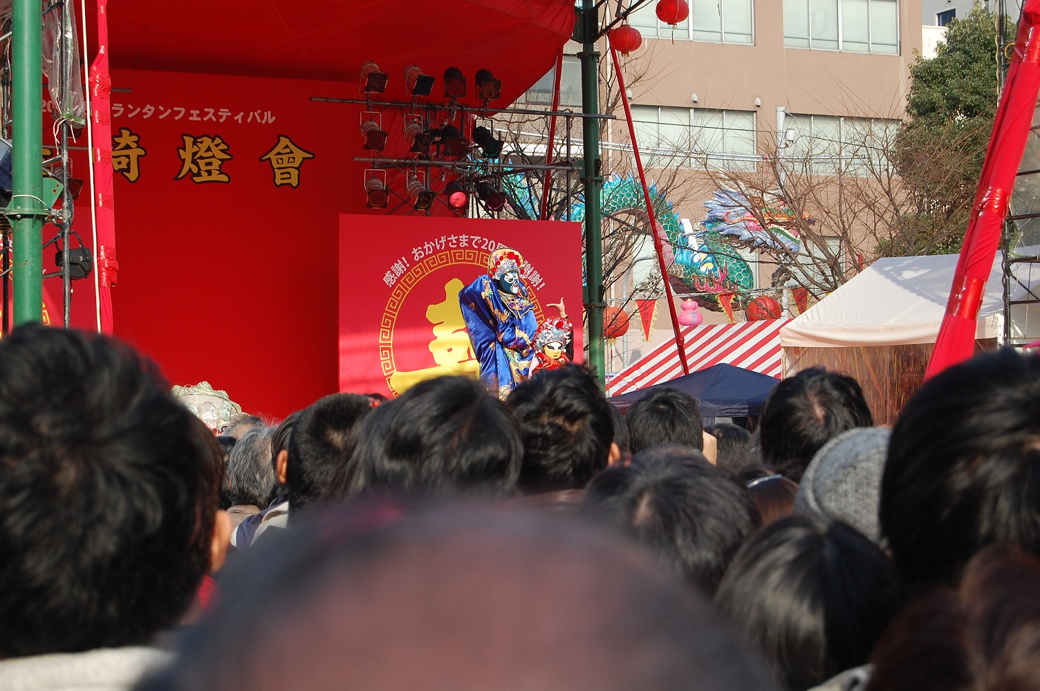 あと、新地公園の会場では、蛇踊りをやっていました。一通り舞台で演じた後は、中華街を通り抜けてどっかへ行ってしまいました。