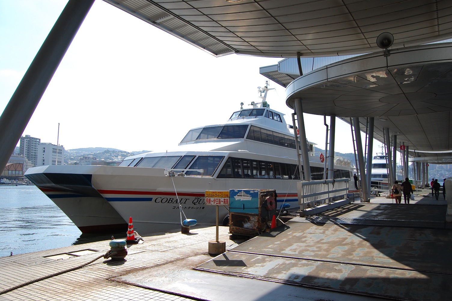 今回乗ったのは定期連絡船のコバルトクイーン号。荒波というか揺れに強い双胴式の船です。製造年を見るに20年ほど前の船らしく、トイレや座席の作りはちと古い感じでした。