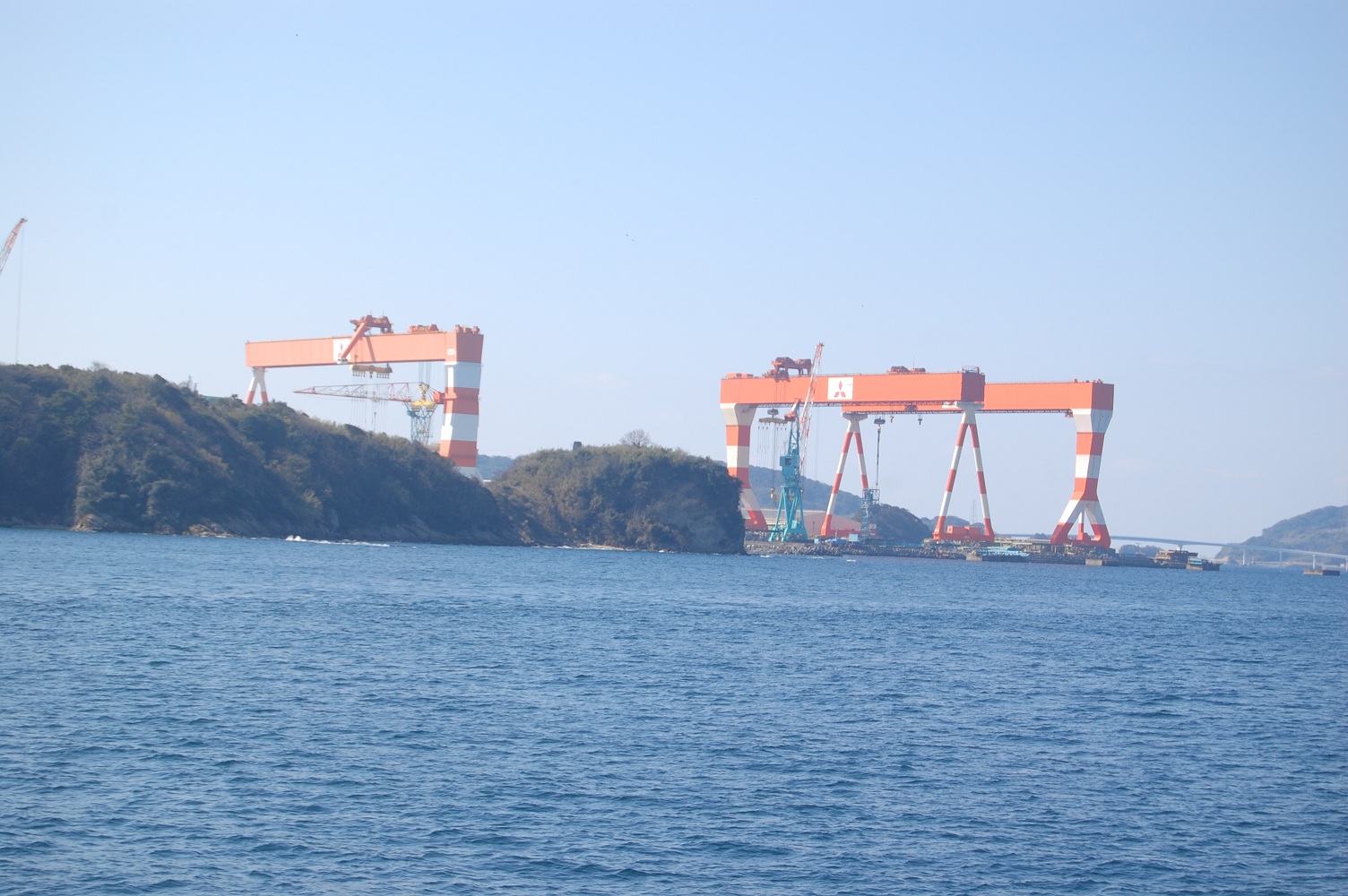 これは三菱重工長崎造船所の香焼(こうやぎ)工場。同社最大の工場で、巨大のクレーンが目を引きます。なお、現在ここには天然ガス用のタンカーが入っています。