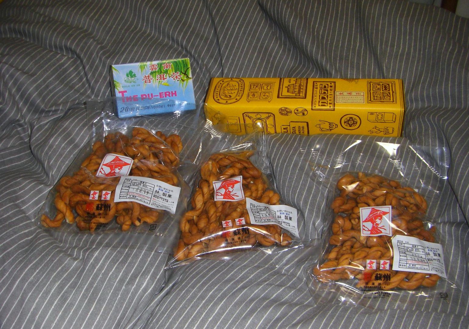 お土産らしいお土産のよりより×3と福砂屋のカステラ。個人的にカステラは福砂屋のが最も好きです。端っこに見えるのは向こうの家で飲む分に(興味本位で)買ったプーアル茶ですが、このメーカーのはまずいな・・・まだティーバッグ1個しか消費してないんですが、どうしましょう。