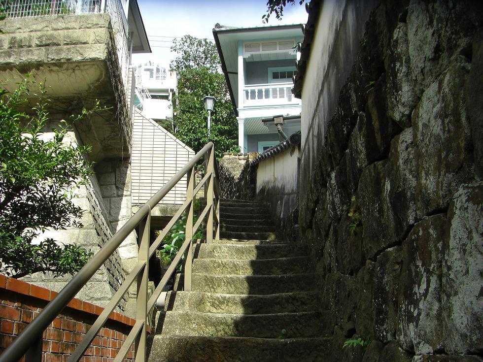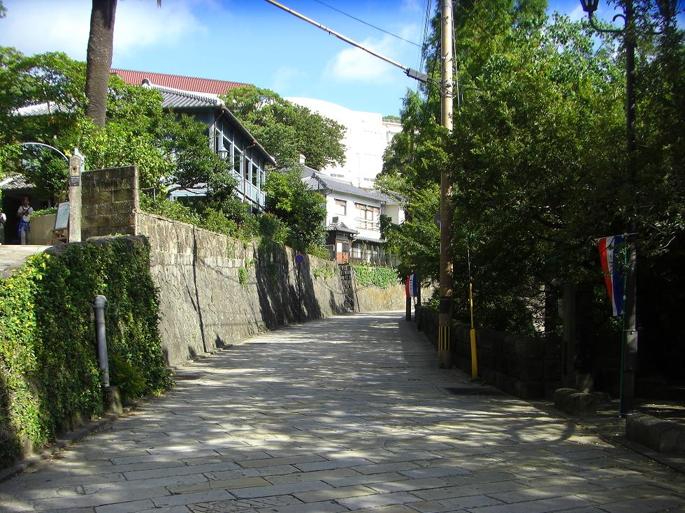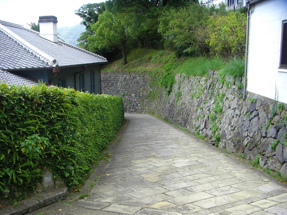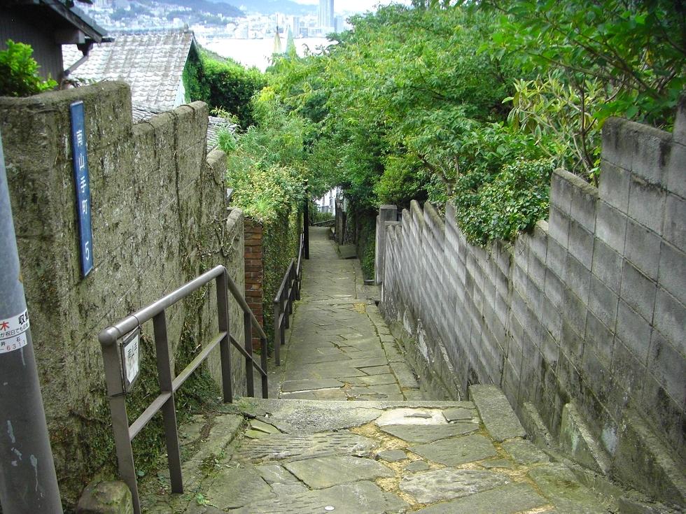 上の洋館を出たところの坂。このような景色もまた長崎の名物の一環です。
