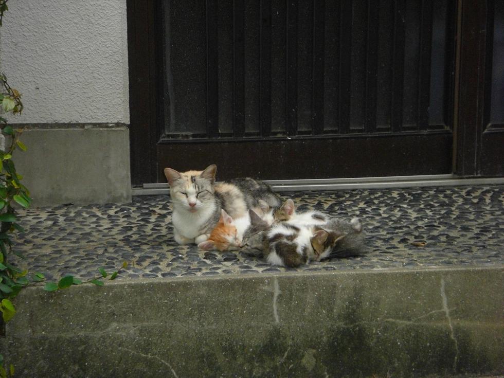 民家の玄関でたむろする猫一家。親父(?)は写真の外でエサを食べていた。