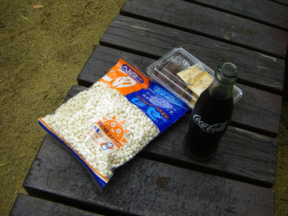 結局餅は半分残して包んでもらったものの、それでも飽き足らずコーラとポン菓子を買って一服。