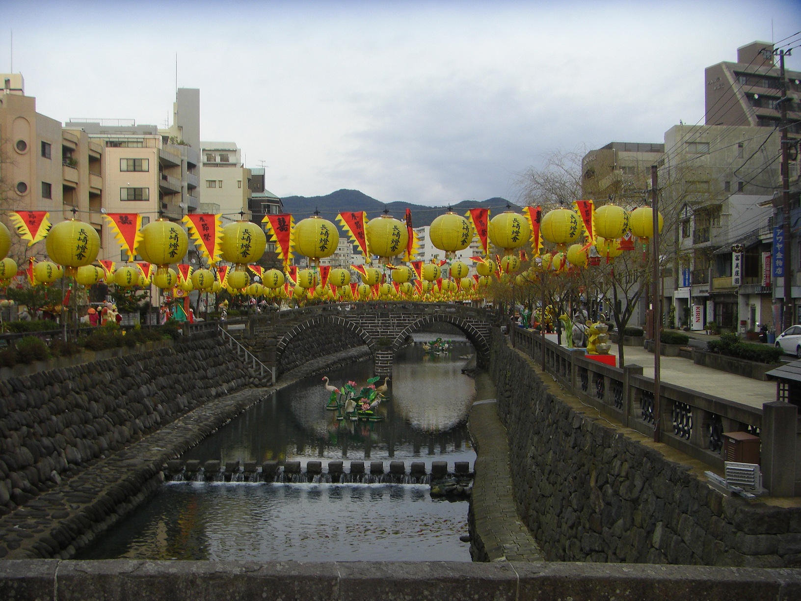 もう当ブログで幾度もアップしている眼鏡橋のあたりも、いつもとは違ってこんな感じで提灯だらけです。もっと暗いうちに行くと、多分綺麗に提灯が灯っているのでしょう。