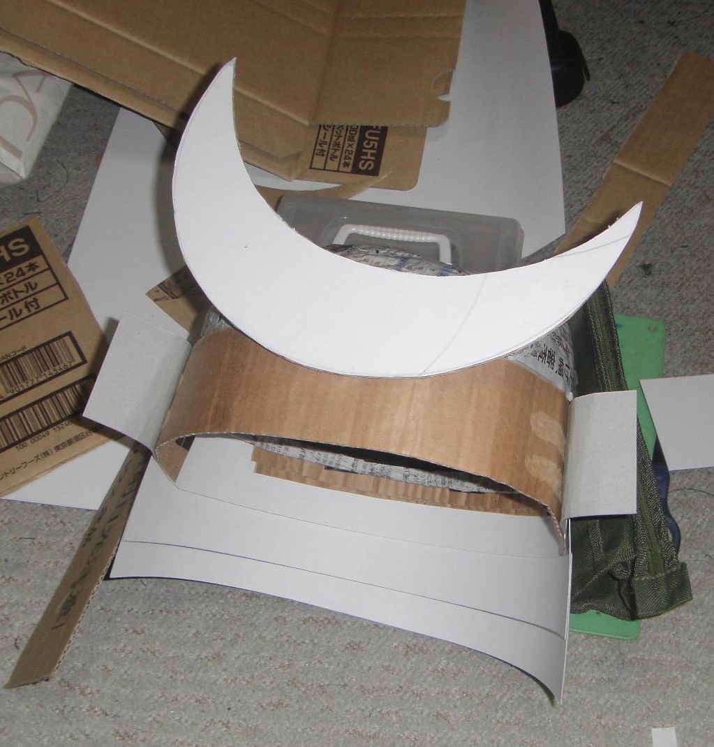 計画段階では三日月の鍬形を考えていましたが、微妙だったのでオミットしました。ただ、要望があれば着ける予定だったので、一応鍬形も完成させて現地に持っていってました(結局使わなかったが)