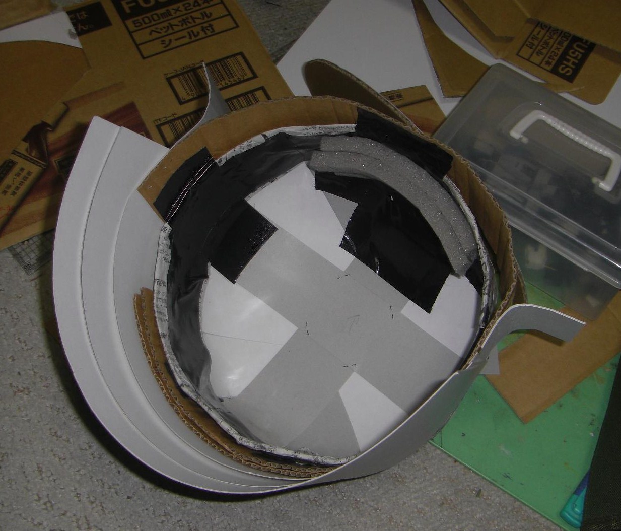 思ったよりもヘルメットが安く手に入らなかったため、本体はふと思いついた厚紙のフレームに新聞紙を張り子の要領で作りました。後頭部を覆う「しころ」は、制作途中で気が変わって小さく広がりのない物とし、手ぬぐいを垂らす事を前提とした物にしました。