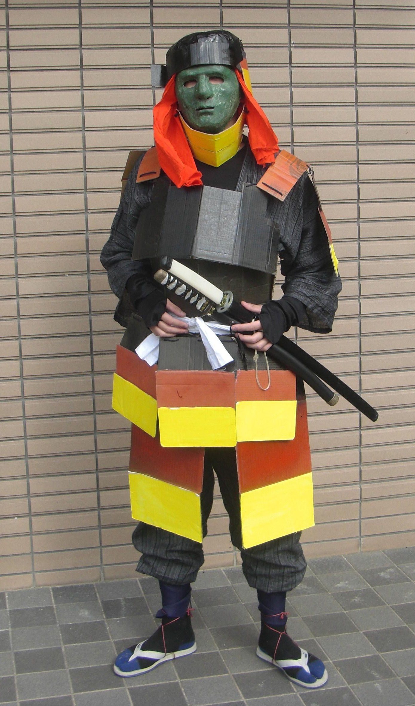 兜や佩盾は詳しい事は後日紹介するので、その他の制作途中の写真がないパーツの詳細としては、腕に百均の日よけカバー、脛には切った貼った下だけの布(後ろが若干めくれていますが、本来はぴっちり締まる)を巻いてハバキとし、帯には適当に切ったり縫ったりした長いハギレを使いました。