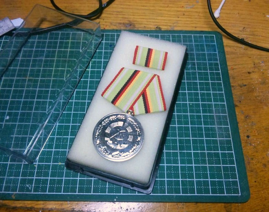 東ドイツ自体、東西ドイツの統合で解体されてからさほど年月の経ってない国なので、このテの勲章などは新品の本物がゴロゴロしてるみたいです。