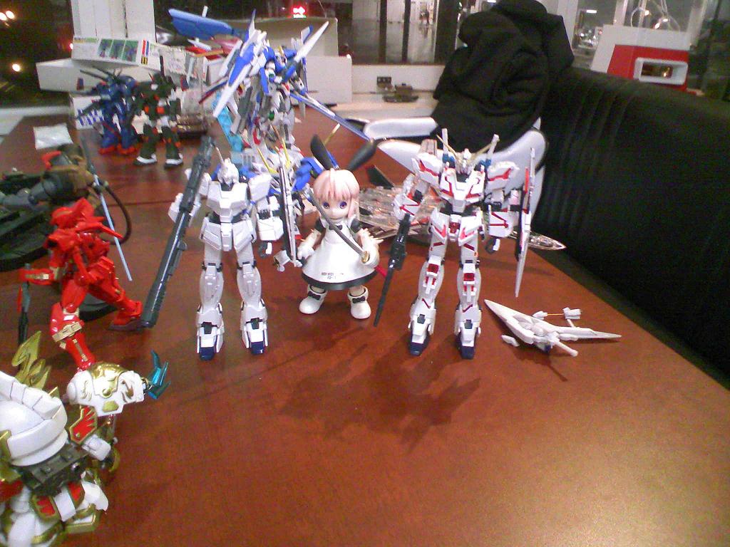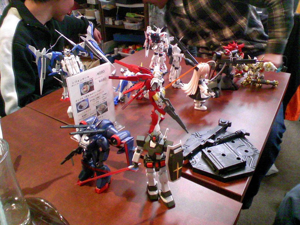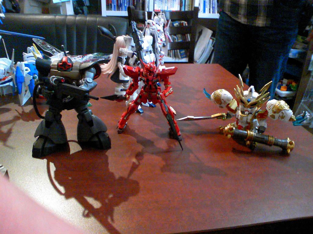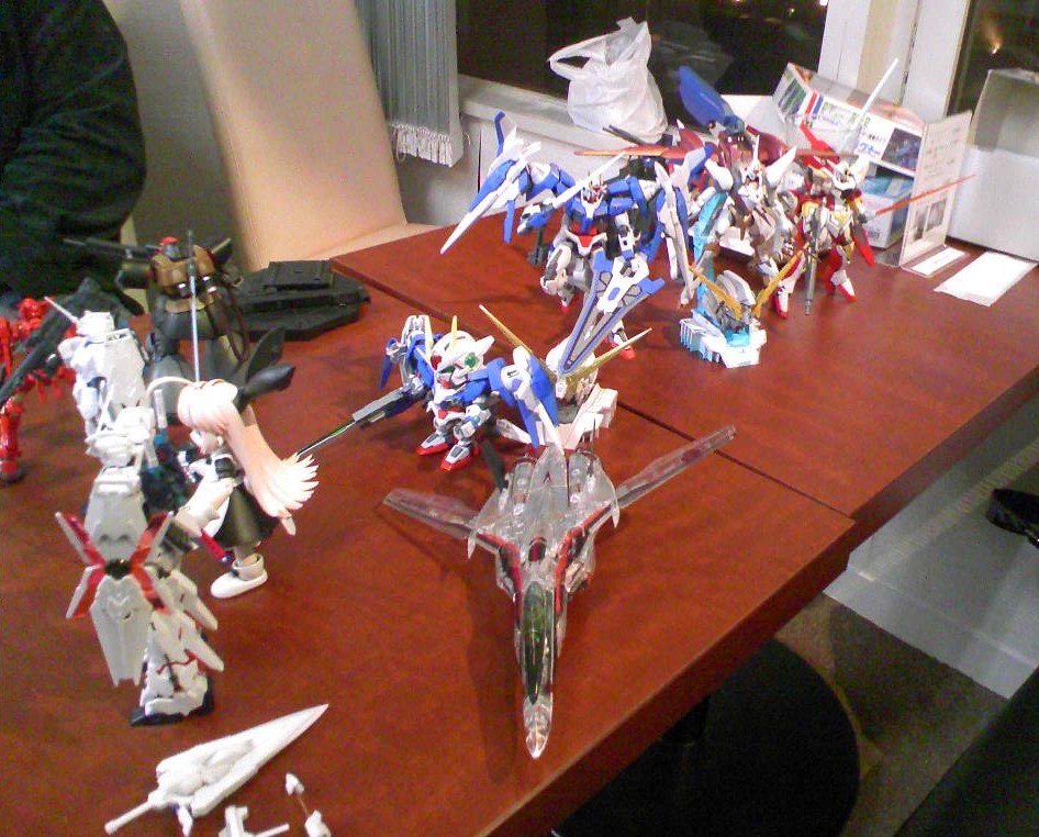 テーブルの様子。手前がボクの持ってきたD-2とFAガンダム(写真は軽装状態)です。