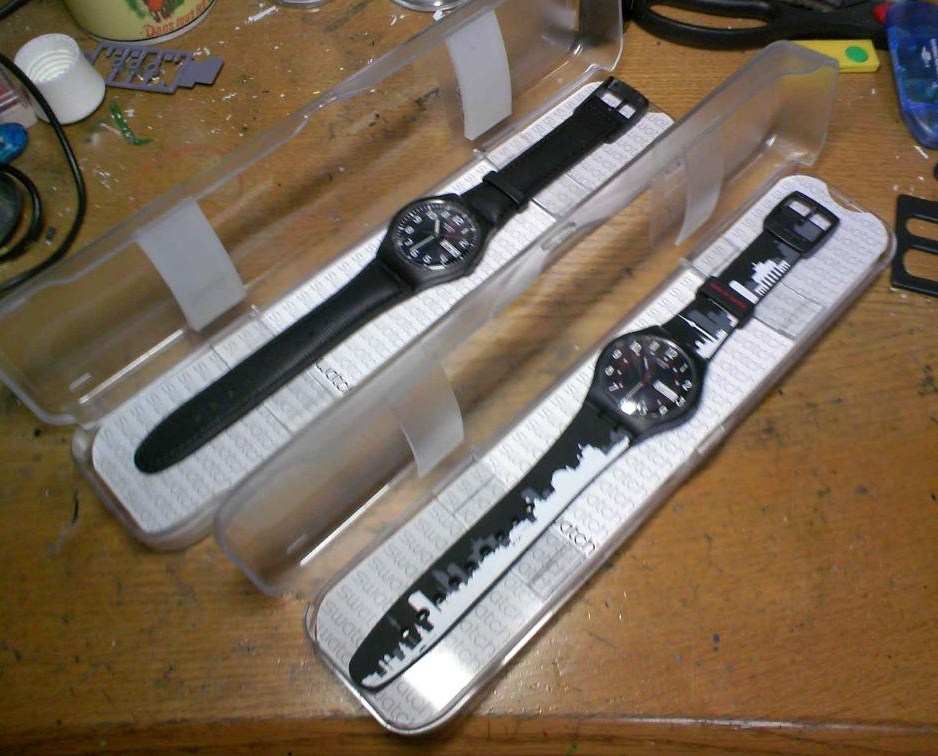 スウォッチの時計。右はベルリンスペシャル。あんまり高くなかったので、親父用にもう一つ黒い物も購入。