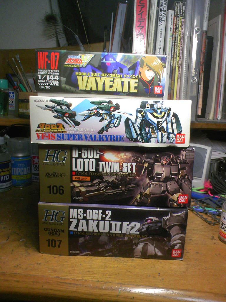 今日の戦果。ロトとヴァイエイトはガンダムズ、可変VF-1はまんだらけ、ザクF2はヨドバシで購入。F2がジオン仕様でない以外は概ね思い通りの物が買えました。
