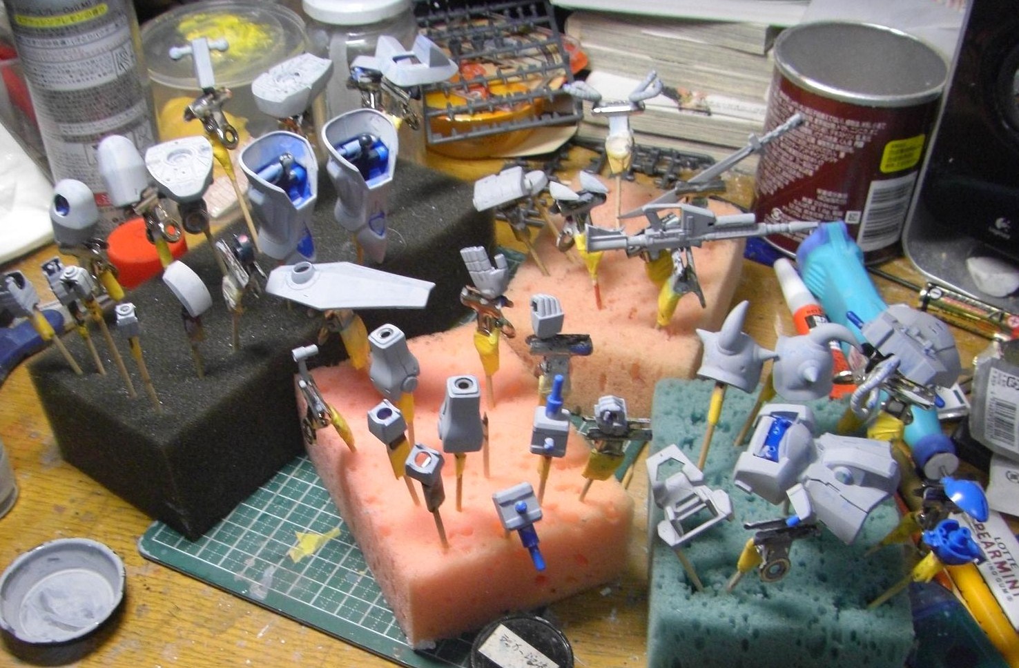 他にも胸や膝の黒いパーツを後ハメ化したり、マシンガンを接着したり・・・大まかな加工は今日中にほぼすべて終了しました。