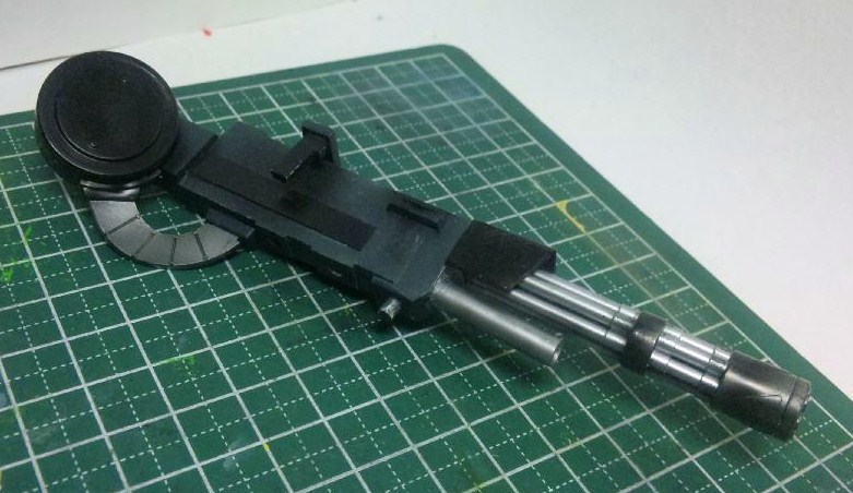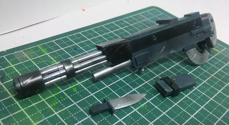 基本的にプラ板の箱組みですが、砲身とマガジンのみ、コトブキヤのアーマードコアのキット用の拡張パーツのガトリングから流用しています。