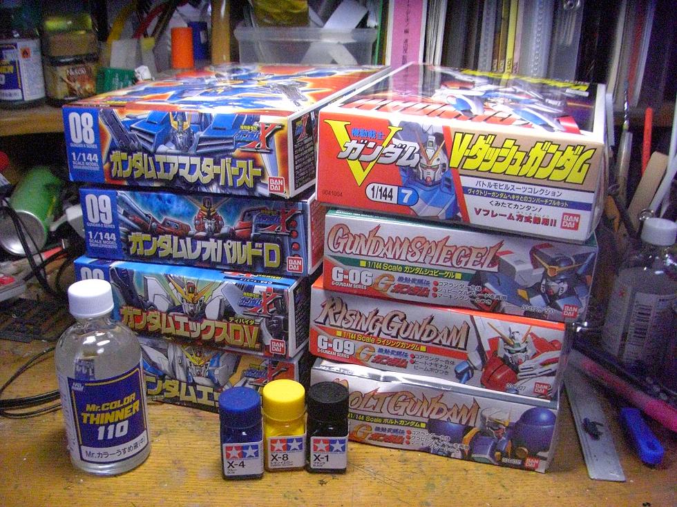 GX、GXDV、エアマスターバースト、レオパルドデストロイ、Vダッシュ、ライジング、ボルト、シュピーゲルと、エナメル数色、ラッカー溶剤など多数。総計で約3700円(更に1割引きだったので実質3400円)でした。豪華仕様のVダッシュ以外は多分420円くらいじゃないかな~と思ってましたが、実際は367円で、依然想定していた値段(約4100円)に比べ大幅な修正がありました。