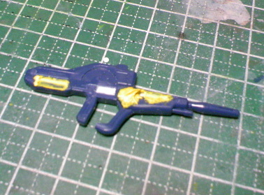 肉抜き穴が顕著だったビームライフルは、細長い穴をプラ板と瞬着で塞ぎ、丸穴をポリパテで埋めました。