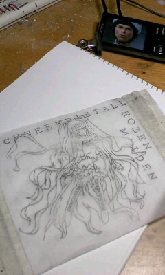 まずトレーシングペーパーに鉛筆(2~4Bあたりがいいかも)で適当な絵を描きます。名前は「雪華綺晶」のドイツ語表記で「Schnee Kristall」と書いてみました。こう見えてもボク実はちょっとだけドイツ語が話せるんですよ(自賛