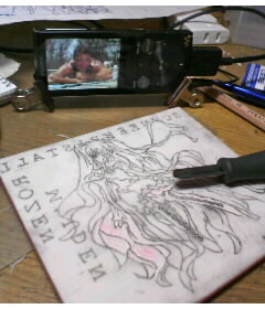 彫る図柄にもよりますが、個人的に顔のパーツは人物画で最も重要な区画なので、ここだけは妥協せずにデザインナイフを使用。しかし仕上がりが・・・・(苦笑)
