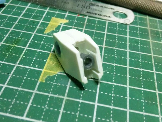 ポリキャップはバンダイの物を使用。軸受は多分4ミリくらいあるので、0.5ミリプラ板で軸受けを新造。その影響で太腿が1ミリ幅増しされましたが、元々少しばかりボリュームが欲しいと思っていたのでまあ良しとします。ふくらはぎも軸受が大きいので、ここもコレと同じ要領で加工するつもりです。