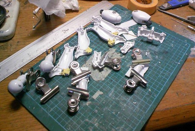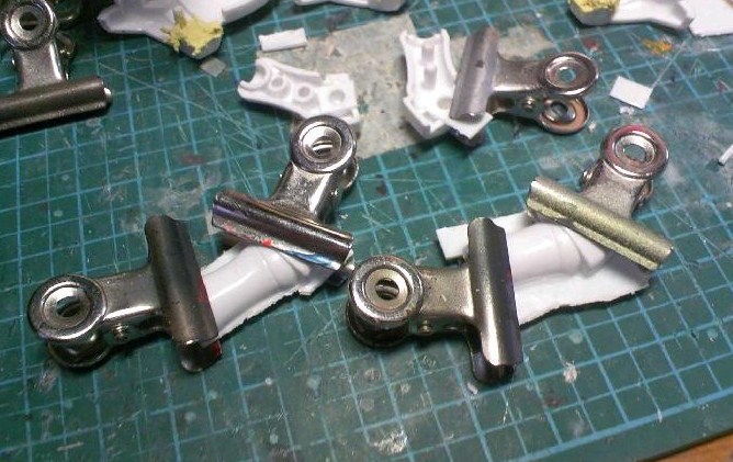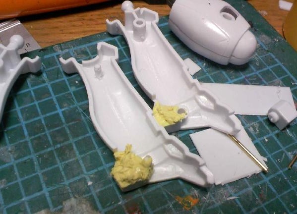 膝は元の2重関節を排した代わりにポリパテを写真の位置に詰め、新たにポリキャップを設置する予定。要はHGでよくある接続方式にする訳ですな。