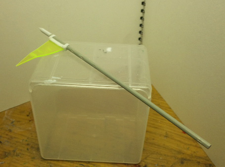 続いて本日の目玉であるフェイロンフラッグは、手頃な長さのプラ棒(太さは大体2.5ミリくらい)に旗状にカットしたクリアイエローの下敷きを取り付け(一応補強を兼ねてプラ板でディテールアップしてある)、更に太さの違うプラ棒で作った穂先をくっつけて製作。形は設定とは大幅に異なりますが、そこは資料不足という事でご勘弁を。