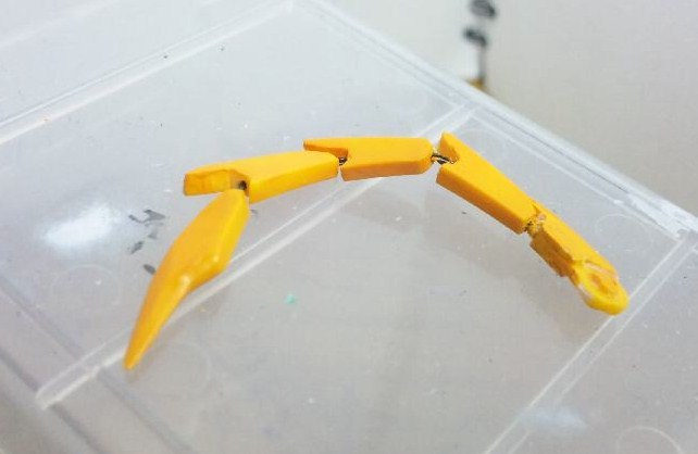 弁髪刀は節ごとにカットして1ミリ径の穴を開け、そこに極小のエナメル線を3本ほど通して自由可動化。先端は鋭利に削りました。