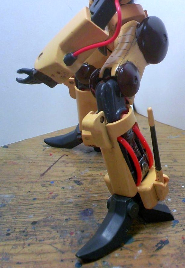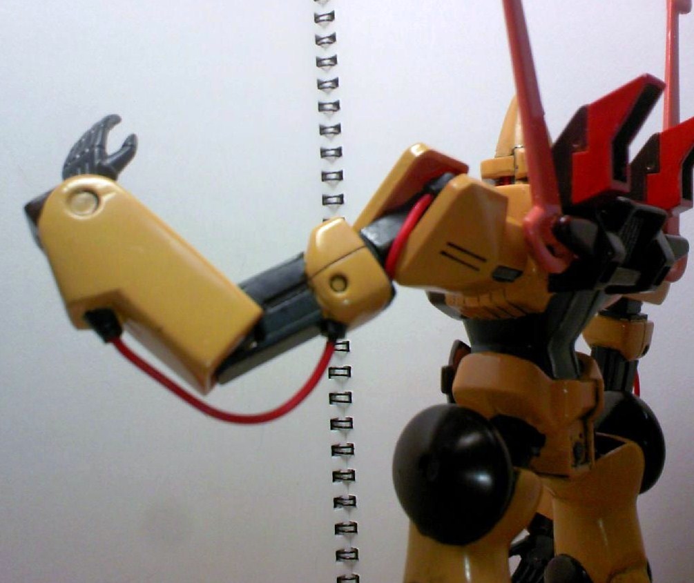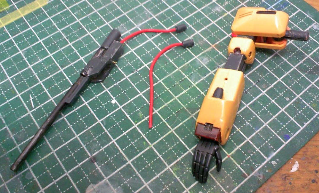 ケーブルはキット付属のものではなく、より柔軟なリード線を使用。ねじる動きにも十分な余裕を持って対応します。 また、右腕のみ武装を取り付ける都合でケーブルを外せるようにしています。