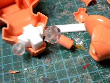 右腕のパワーランチャーは、下の方を延長して接続用のジョイントにしたほか、バランス調整で5ミリの丸いプラ棒でコンデンサ的なパーツを追加しました。