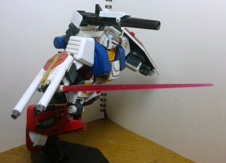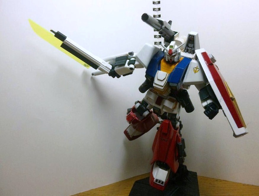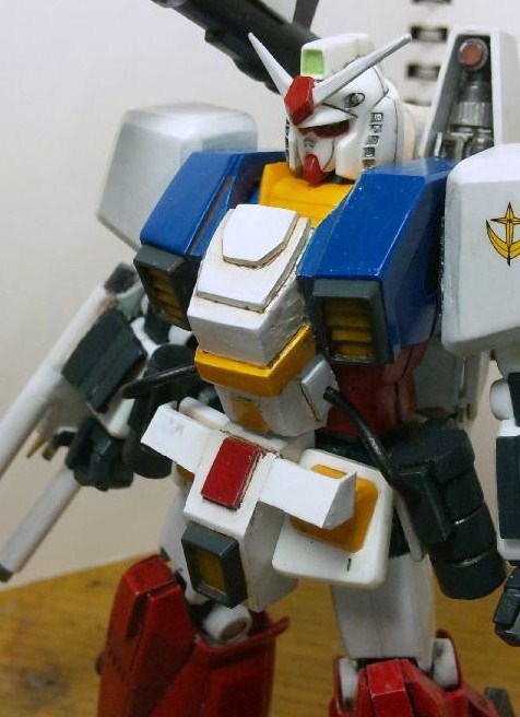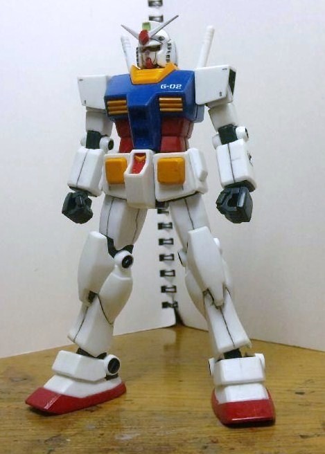 素体のガンダムは大昔にHPにアップしていたガンダムを再改修したもので、合わせ目のパネルライン風に処理し、折れたツノをFGの物に変更してあります。ちなみに胸の「G-02」のデカールは、プロトタイプで余った物を使いました。