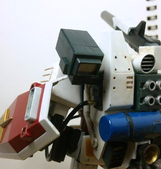左側にあったアンテナは排除し、代わりにマウントラッチを設置しました。 この部分はヘビーガンダムと連動しており、ミサイルポッドや火炎放射機、大型ナイフなどを装着できます。
