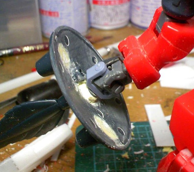 クラッシュシールドも肉抜き穴を埋めたついでだと思い、中央の穴にポリキャップを埋めてみる。グリップはHGフォビドゥンのハンマーの物を流用。やっと有効活用できた・・・