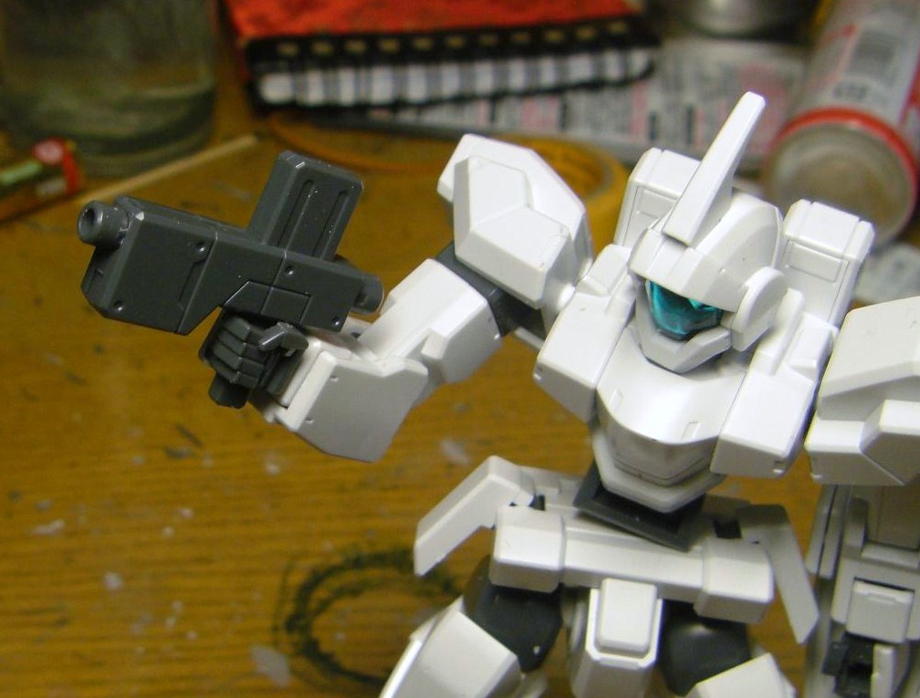 主武装のビームスプレーガンⅢBは、ジェノアスのスプレーガンよりも大型化されたほか、下に銃剣が追加されました。可動云々に関しては以前制作したジェノアスを参照してください。