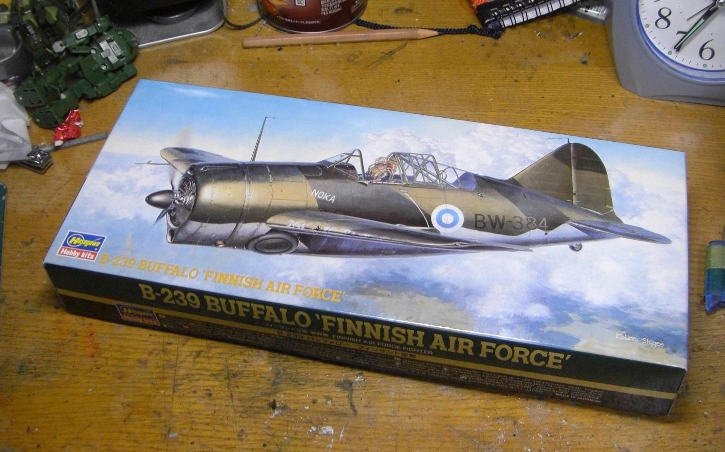 今回クリスマスプレゼント(?)として譲り受けたのは、ハセガワのF2A・・・フィンランド空軍仕様なので機体名称は「B-239」ですが、これは以前一緒に日本橋に行ったときに人に譲るつもりで買ったら肝心の当人が音信不通となって宙ぶらりんになってたものだそうです。