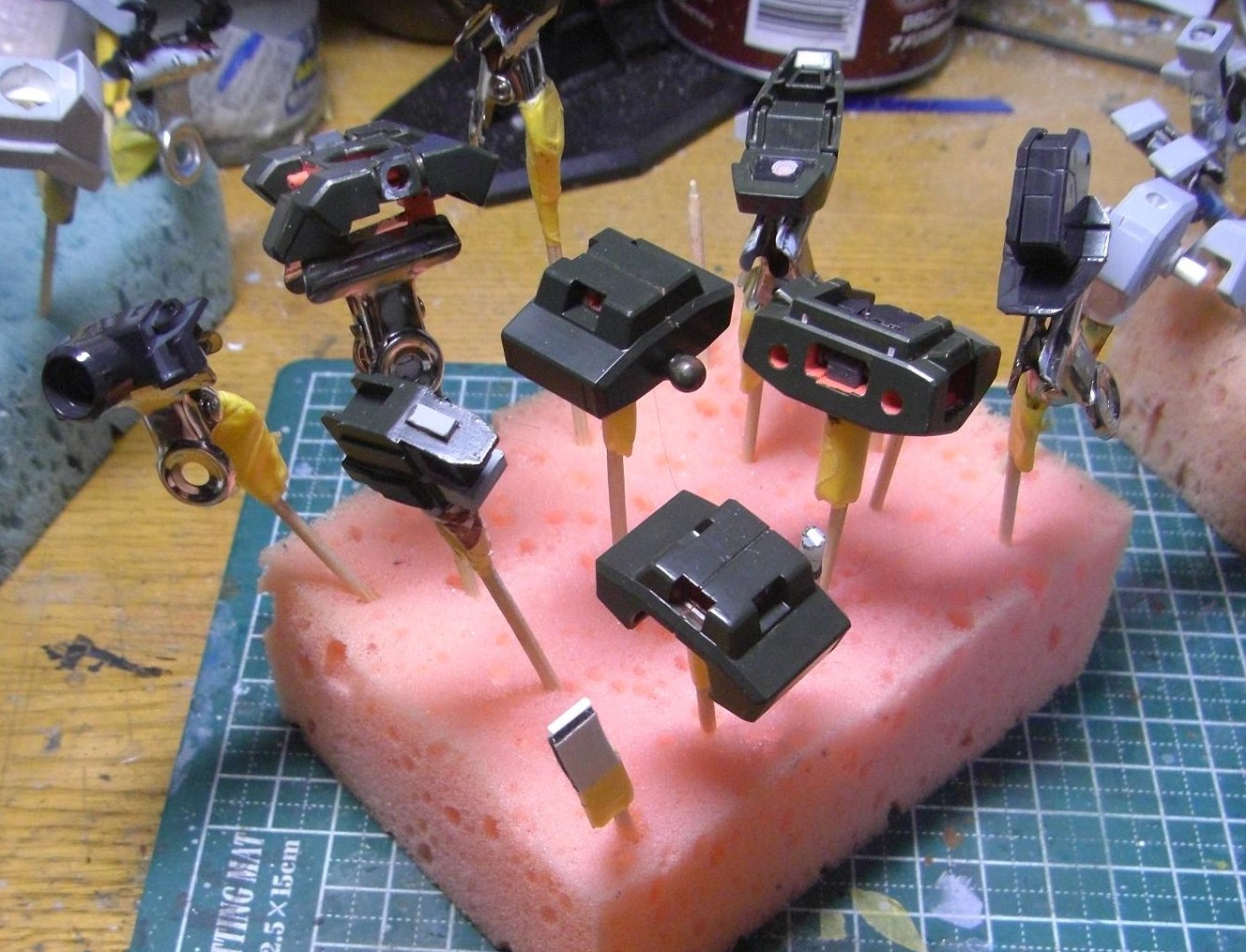 今日から色付けの作業に入りましたが、本体カラーは赤というかオレンジが合わないと思ったので、暗いグリーンを塗りました。何だかミリタリーちっく。