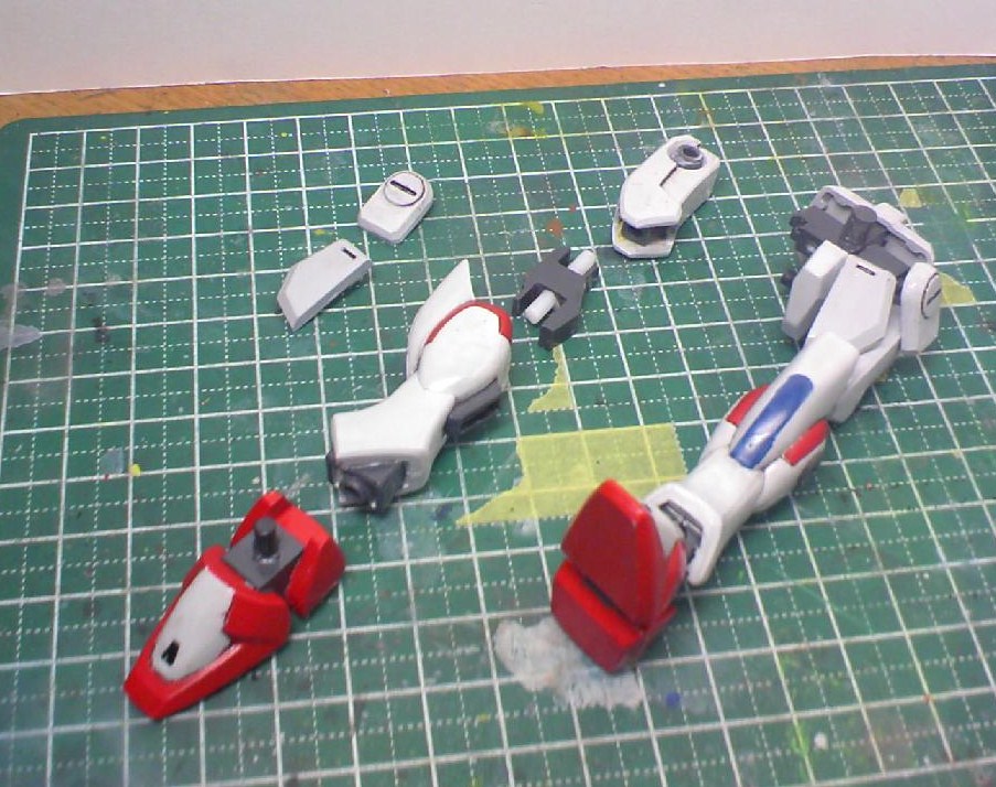 膝は関節を仕込む以前にジャンクと化していたものを使い、新たにHG式の関節を仕込みました。なお、膝関節のパーツは105ダガーの物を参考に、ほぼ同じものをプラ板で自作しています。