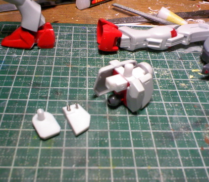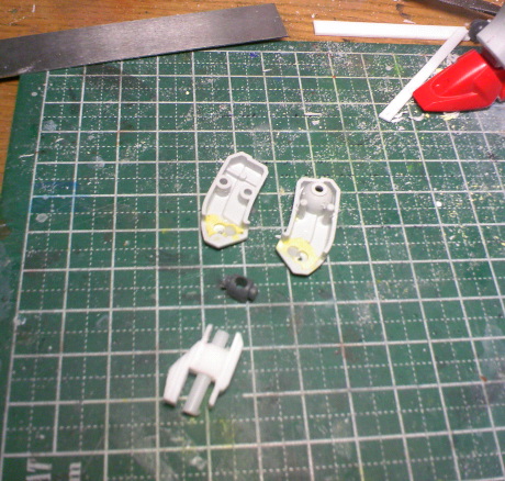 まず太股は、膝関節にポリパテを詰め、穴を空けてポリキャップを入れました。ちなみにスペースの都合上合わせ目で0.5ミリ幅増ししています。