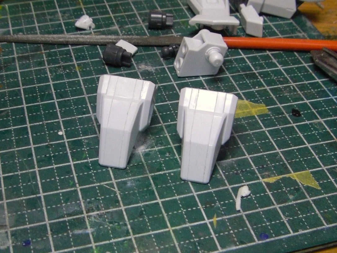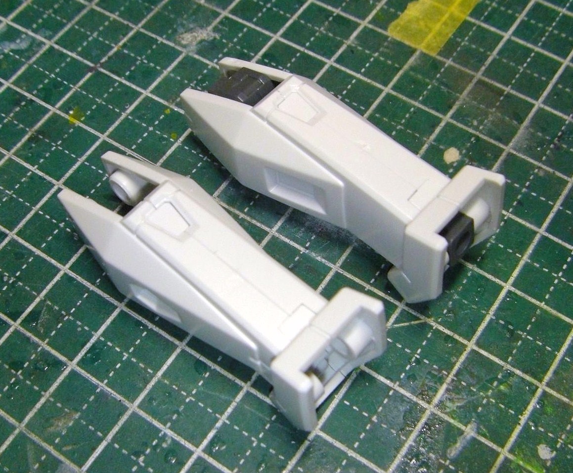 脚は最初合わせ目を消そうと思ったのですが、前がモールド処理されているため、それに合わせてこちらもフチをデザインナイフでカリカリ。肩はジェノカスとまったく同じ要領ですね。