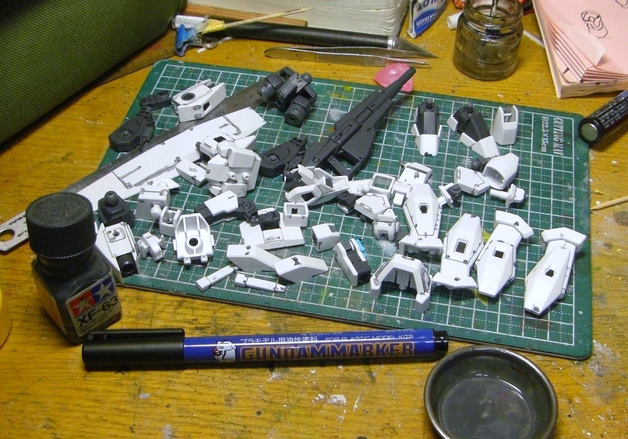 あと、関節は黒でスミ入れする予定だったんですが、なるべくエナメル塗料を(換気的な問題で)使いたくなかったので、初めてですがガンダムマーカーのスミ入れペンを使う事に。