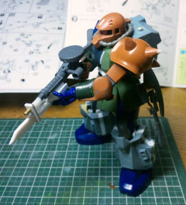 メイン武装のザクマシンガン(例によってガルマザクから)は、グリップと銃口が折れていたので、プラ板・プラ棒・プラパイプ・真鍮パイプで新しい銃口とグレネードランチャーを追加しました。