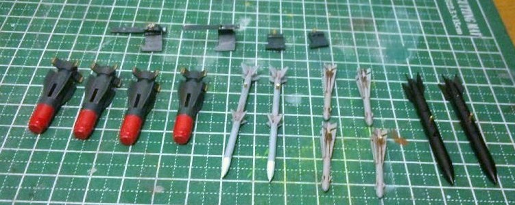左から、HGムラサメ量産型の大型ミサイル×4、ハセガワのウェポンセット?のAMRAAM×2およびファルコン×4、F-117で余った爆弾×2となっています。