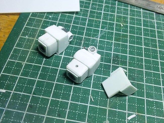 んで、ヘビーガンダムは腕の装甲がヒジ周りが太く手首の方へ向かうにつれて細くすぼまる様な形状なので、当初は新品がもう二つあるプロトタイプから流用しても良かったのですが、今回はジャンクからの流用のみという制約があるので、今回はHGUCガンダムの物をプラ板で思いっきり太らせるだけにとどまりました。