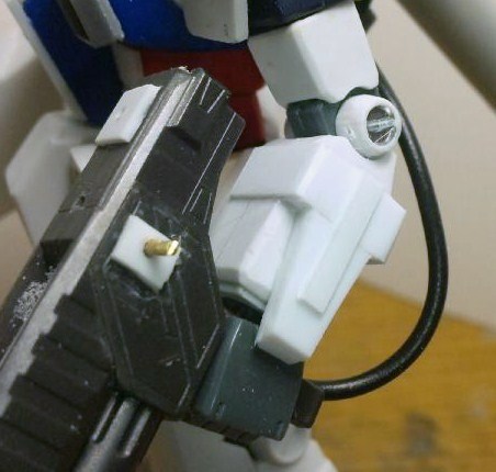 そのままでは寂しいと感じた左腕には、ボツにした手首アーマーの試作品を改めて使用。本来はもっと下寄りになる予定だったのですが、ヒジ周りの装甲オミットに従い接着位置を変更しました。
