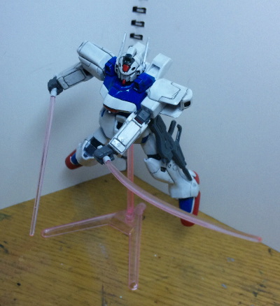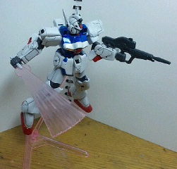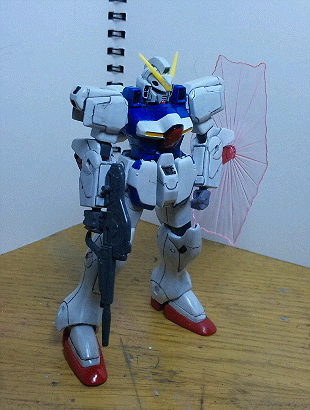 Vガンダム単体での武器はビームライフル・ビームシールド・ビームサーベル2種(ビームが真っすぐな「止めポーズ用」と大きく反った「決めポーズ用」)が付属。他にもクリアパーツのスタンド(飛行用と固定用の2種類のアームが付属)とそれに接続できる背景カード用のスタンドが付属するという豪華ぶり。というかMS本体がやたらと小型化しているので、それだけ低価格で豊富なオプションが付けれるのでしょう。あと、以前ジャンクにしたV2からハリセンサーベル(扇型のサーベル)を流用しました。