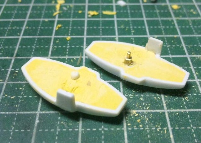 基本的にV2もバスターも、このような肉抜き穴は基本的にプラ板で埋めているんですが、足のミサイルポッドのみポリパテで埋めてから真鍮パイプのジョイントに改めました。ちなみにポリパテの使用部位はここだけです。